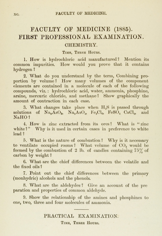 Initially the medical curriculum was of five years' duration, the first year being spent in the Faculty of Arts, followed by four years of medical study. Even the first curriculum was a rigorous and daunting programme. The 1884 Calendar outlines the curriculum as follows. Second year studies comprised: Chemistry (including Practical Chemistry), Botany, Zoology, Comparative Anatomy (with demonstrations) and Human Anatomy (with dissection sessions of two hours per day in Lent and Trinity Terms). In Michaelmas Term, students reported to the Prince Alfred Hospital at 2pm each day for afternoon clinical work. In the third year, the subjects studied were Anatomy, Physiology (including Practical Physiology), Surgery and Practical Pharmacy. Hospital practice was included in all three terms.