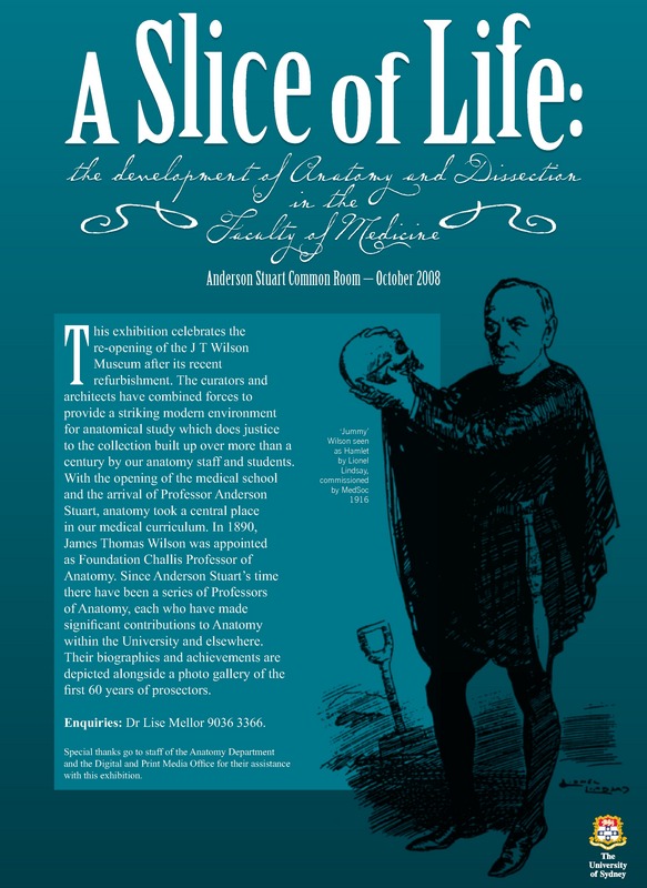| + | This exhibition celebrated the re-opening of the [http://www.anatomy.usyd.edu.au/museums/wilson/index.html '''J T Wilson Museum'''] after its recent refurbishment. The curators and architects have combined forces to provide a striking modern environment for anatomical study which does justice to the collection built up over more than a century by our anatomy staff and students. With the opening of the medical school and the arrival of [[Anderson Stuart, Thomas Peter|'''Professor Anderson Stuart''']], anatomy took a central place in our medical curriculum. In 1890, [[Wilson, James Thomas|'''James Thomas Wilson''']] was appointed as Foundation Challis Professor of Anatomy. Since Anderson Stuart’s time there have been a series of Professors of Anatomy, each who have made significant contributions to Anatomy within the University and elsewhere. Their biographies and achievements are depicted alongside a photo gallery of the first 60 years of prosectors. Exhibition: From October 1 2008 to end March 2009. | ||